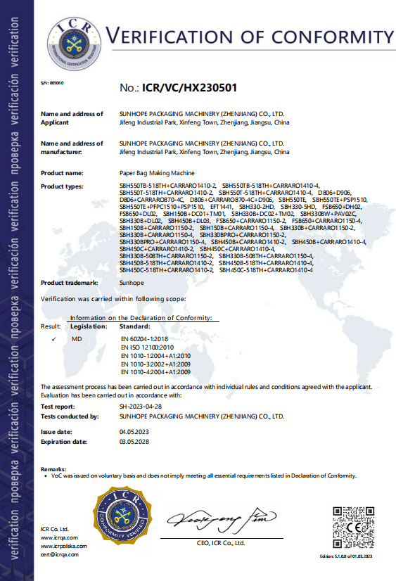 - شهادة CE لماكينة تصنيع الأكياس الورقية